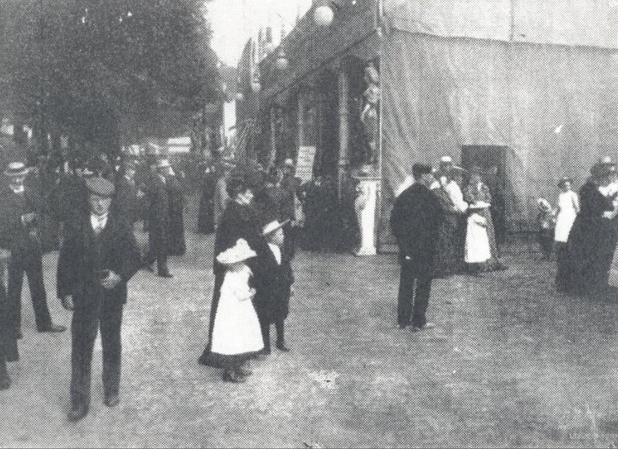 Op de kermis stonden verschillende draaimolens. Er was een gewone draaimolen, een stoomdraaimolen en een fietsdraaimolen. Die laatste was een attractie met fietsachtige zitplaatsen of trappers, waarbij bezoekers in een cirkel ronddraaiden. Rond deze attracties was veel lawaai, beweging en gedrang. De sfeer was uitbundig. Er werd gegooid met serpentines en confetti, en bezoekers werden ook geplaagd met natte slierten papier, pauwenveren, spuitjes met geurwater en zelfs fijne stukjes steenkool.