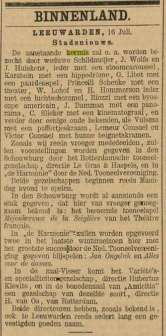 De kermis hoorde bij een groter stadsfeest. Op maandag was er harddraverij aan de Marsumerweg. Daarbij waren verschillende publieksvakken of terreinen, waarvoor men verschillende prijzen betaalde. Er was een beter gelegen of duurder vak van 25 cent en een goedkoper vak van 10 cent. De harddraverij trok veel publiek en hoorde duidelijk bij de feestweek van de stad.